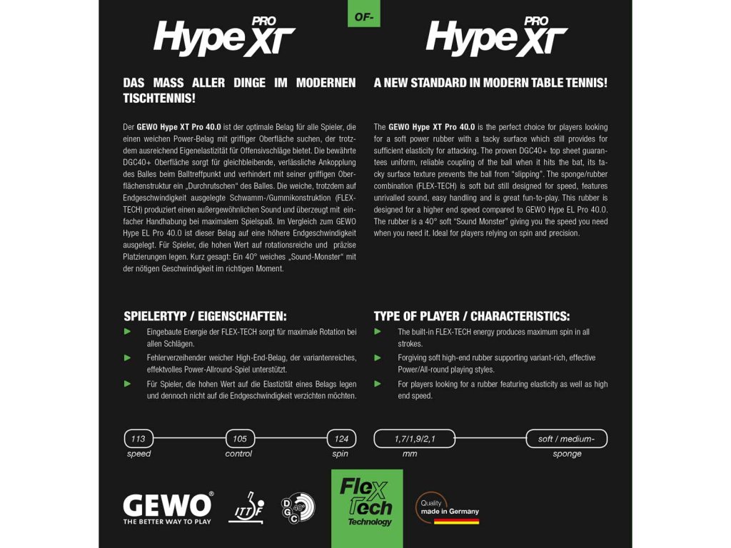 GEWO Hype XT Pro 40.0 je optimálny poťah pre všetkých hráčov, ktorí hľadajú mäkký, výkonný poťah s priľnavým povrchom, ktorý zároveň ponúka dostatočnú elasticitu pre útočné údery. Osvedčený povrch DGC40 zaisťuje konzistentný a spoľahlivý kontakt s loptou pri náraze a vďaka priľnavej štruktúre povrchu zabraňuje šmýkaniu lopty. Mäkká, ale na vysokú rýchlosť orientovaná konštrukcia zo špongie a gumy (FLEX-TECH) vytvára výnimočný zvuk a zaujme ľahkou ovládateľnosťou pre maximálny herný zážitok. V porovnaní s GEWO Hype EL Pro 40.0 je tento poťah navrhnutý pre vyššiu maximálnu rýchlosť. Ideálny pre hráčov, ktorí oceňujú bohatú rotáciu a presné umiestnenie lopty. Skrátka: 40° mäkký „zvukový monštrum“ s potrebnou rýchlosťou v správnom okamihu.