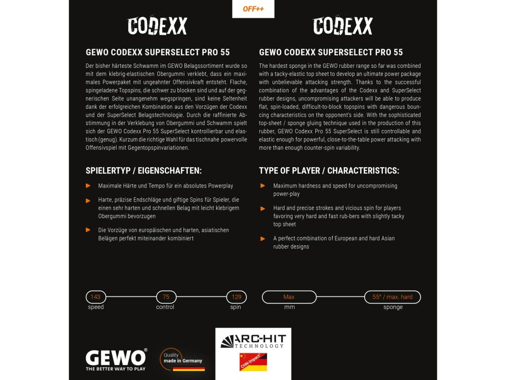 Najtvrdšia špongia v rade poťahov GEWO bola doteraz skombinovaná s lepkavou elastickou vrchnou vrstvou, čím sa vytvoril dokonalý výkonový balíček s neuveriteľnou útočnou silou. Vďaka úspešnej kombinácii výhod dizajnu poťahov Codexx a SuperSelect budú nekompromisní útočníci schopní vytvárať ploché, rotačné a ťažko blokovateľné topspiny s nebezpečnými odrazovými vlastnosťami na strane súpera. Vďaka sofistikovanej technike lepenia vrchnej vrstvy/špongie použitej pri výrobe tohto poťahu je GEWO Codexx Pro 55 SuperSelect stále dostatočne ovládateľný a elastický pre silný, silový útok blízko stola s viac než dostatočnou variabilitou protispinov.